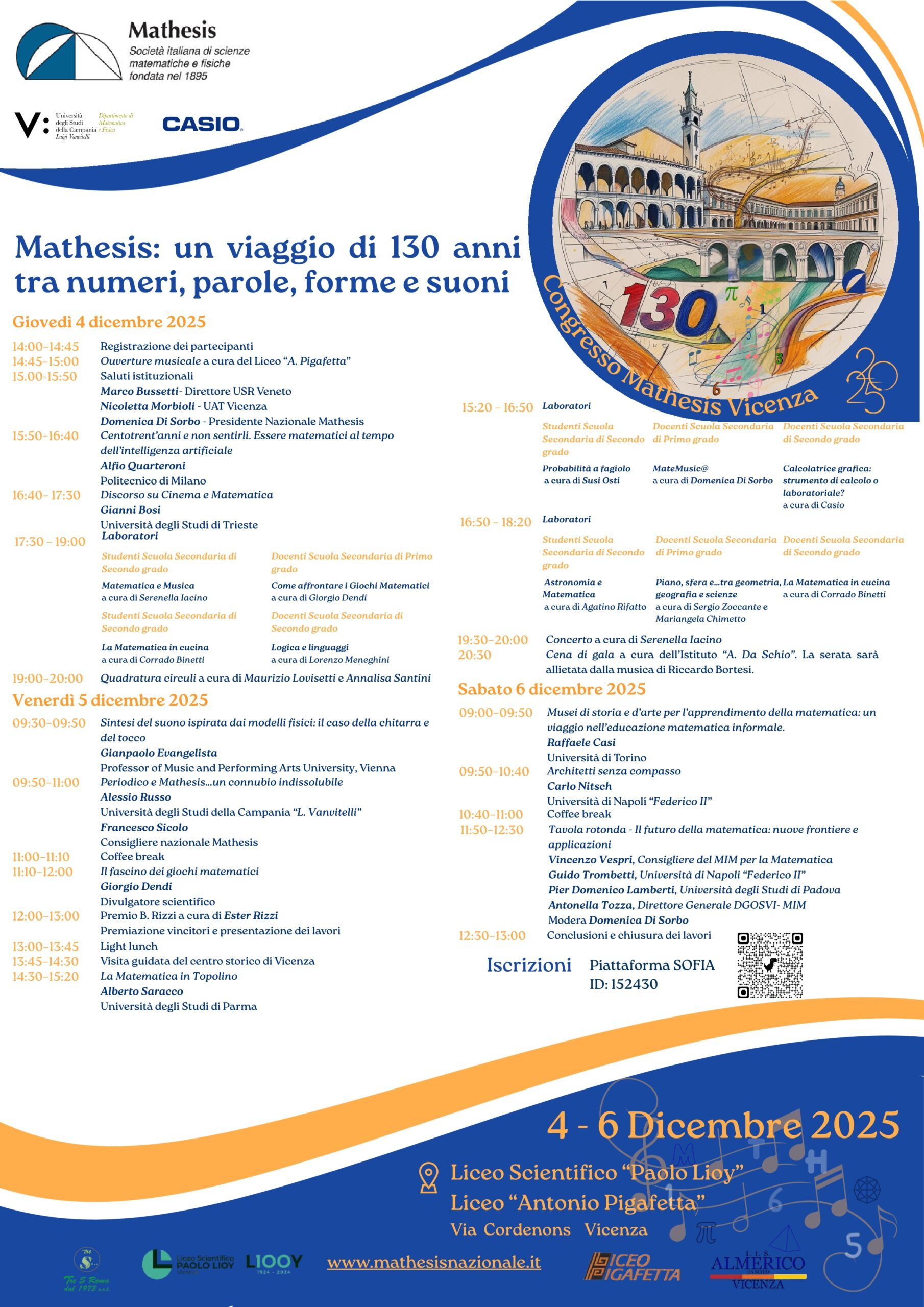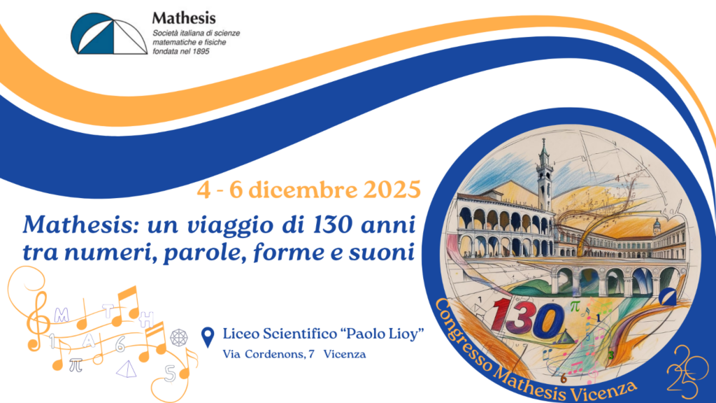 Sono lieta di invitarvi al nostro Congresso 2025 dal titolo Mathesis: un Viaggio di 130 Anni tra Numeri, Parole, Forme e Suoni che si terrà a Vicenza nei giorni 4, 5 e 6 dicembre 2025.