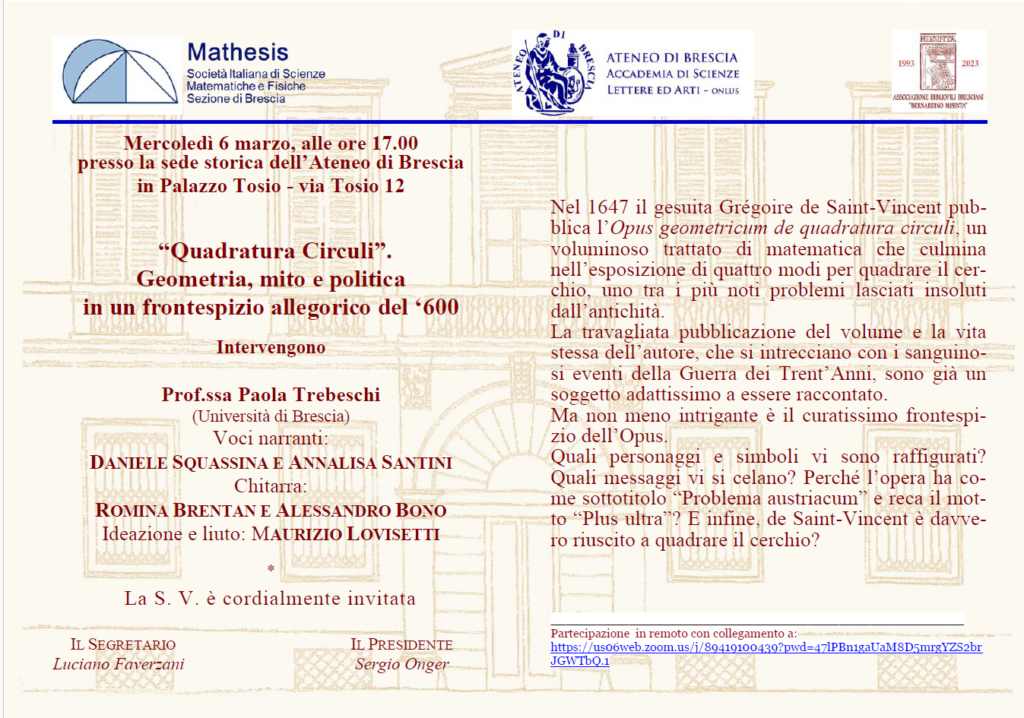 Sezione Mathesis di Brescia. “Quadratura Circuli”. Geometria, mito e politica in un frontespizio allegorico del ‘600.