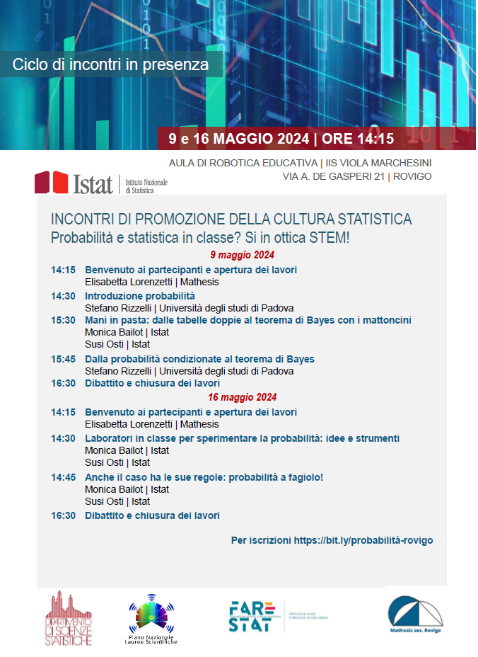 Probabilità e statistica in classe? Si in ottica STEM! AULA DI ROBOTICA EDUCATIVA | IIS VIOLA MARCHESINIVIA A. DE GASPERI 21 | ROVIGO- 9 e 16 MAGGIO 2024 | ORE 14:15 Ciclo di incontri in presenza 9 maggio 2024 14:15 Benvenuto ai partecipanti e apertura dei lavori Elisabetta Lorenzetti | Mathesis 14:30 Introduzione probabilità Stefano Rizzelli | Università degli studi di Padova 15:30 Mani in pasta: dalle tabelle doppie al teorema di Bayes con i mattoncini Monica Bailot | Istat Susi Osti | Istat 15:45 Dalla probabilità condizionate al teorema di Bayes Stefano Rizzelli | Università degli studi di Padova 16:30 Dibattito e chiusura dei lavori 16 maggio 2024 14:15 Benvenuto ai partecipanti e apertura dei lavori Elisabetta Lorenzetti | Mathesis 14:30 Laboratori in classe per sperimentare la probabilità: idee e strumenti Monica Bailot | Istat Susi Osti | Istat 14:45 Anche il caso ha le sue regole: probabilità a fagiolo! Monica Bailot | Istat Susi Osti | Istat 16:30 Dibattito e chiusura dei lavori Per iscrizionihttps://bit.ly/probabilità-rovigo