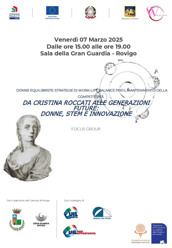 Il 7 marzo Rovigo ha ospitato una conversazione intorno all’8 marzo organizzata da Uil Veneto, Uil Veneto Pari Opportunità e Gruppoformazione – Ente di Formazione. Il focus group è intitolato “Da Cristina Roccati alle generazioni future: Donne, STEM e Innovazione” e si svolgerà dalle 15.00 alle 19.00 nella Sala della Gran Guardia. Sono intervenuti: Valeria Cittadin, Sindaca di Rovigo; Lorenza Cervellin, Segretaria UIL Veneto; Elisabetta Lorenzetti, Matematica; Mia Tosi, Fisica; Susi Osti, Statistica; Elena Canadelli, Professoressa di Storia della Scienza presso l’Università degli Studi di Padova; Gino Gregnanin, Coordinatore Provinciale UIL Veneto Rovigo. Modera la giornalista Francesca Cavedagna
