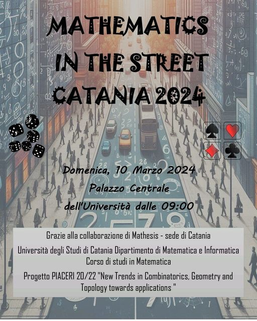Il prossimo 10 marzo dalle ore 9:00 alle 14:00 presso il Palazzo Centrale dell’Università degli Studi di Catania, Piazza Università (CT), in contemporanea con altre città sparse nel mondo, si svolgerà “Mathematics in the Street 2024”, dove un team di appassionati della Matematica, studenti dei Corsi di Laurea Triennale e Magistrale di Matematica, docenti e non, inviteranno i passanti di ogni età a partecipare alla presentazione di giochi, aneddoti, curiosità, indovinelli, paradossi matematici, allo scopo di mostrare l’aspetto gioioso ed affascinante della Matematica.