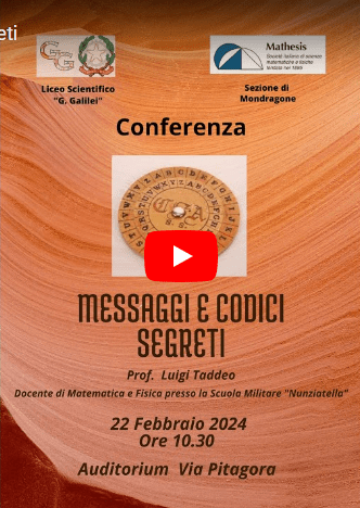 La sezione Mathesis di Mondragone comunica che è disponibile la registrazione della Conferenza tenuta dal prof. Luigi Taddeo il 22 febbraio 2024 presso il Liceo Scientifico “G. Galilei” di Mondragone dal titolo “Messaggi e Codici Segreti”.